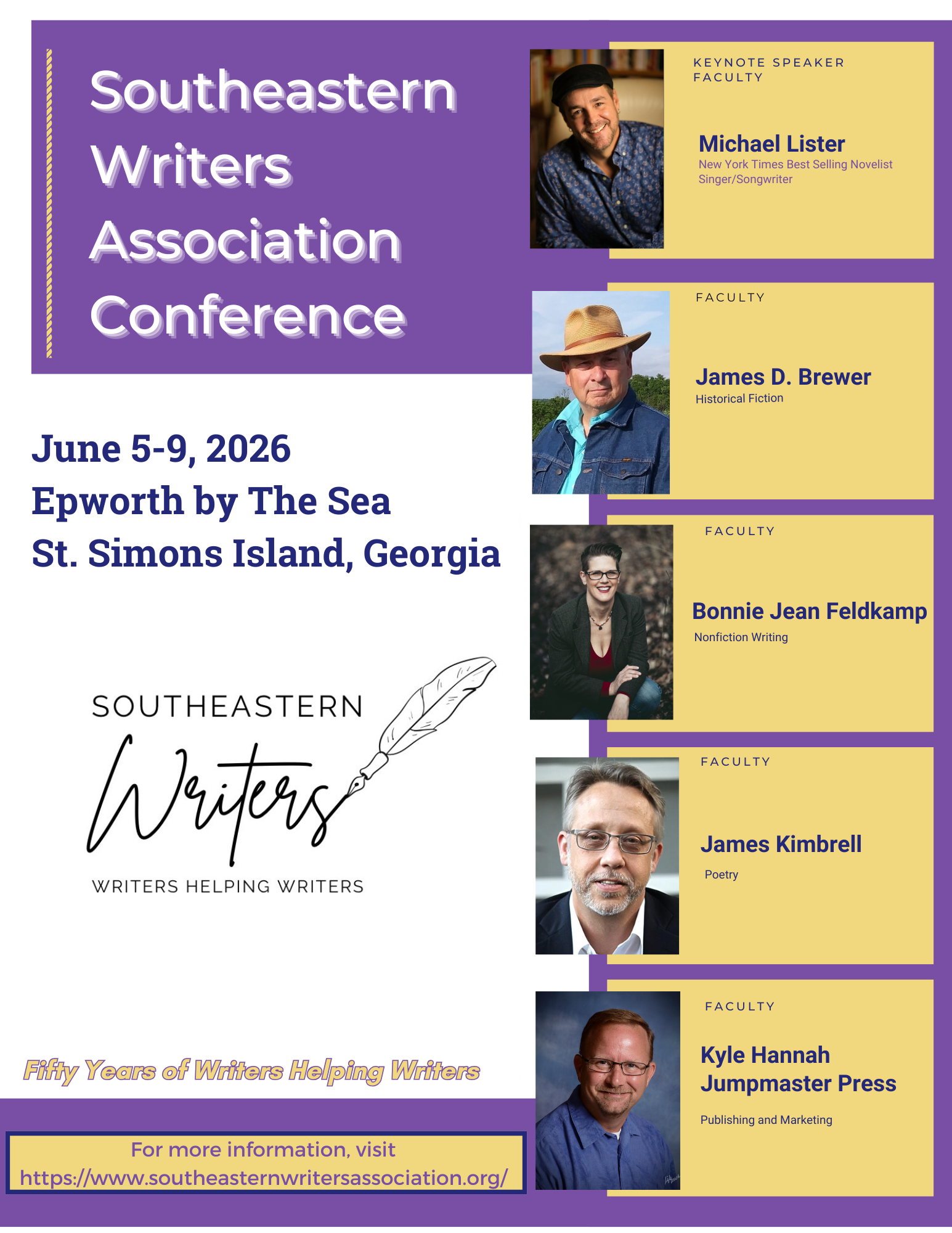 The 2026 Southeastern Writers Association Conference will take place on St. Simons Island, Georgia, from June 5 - 9, 2026.